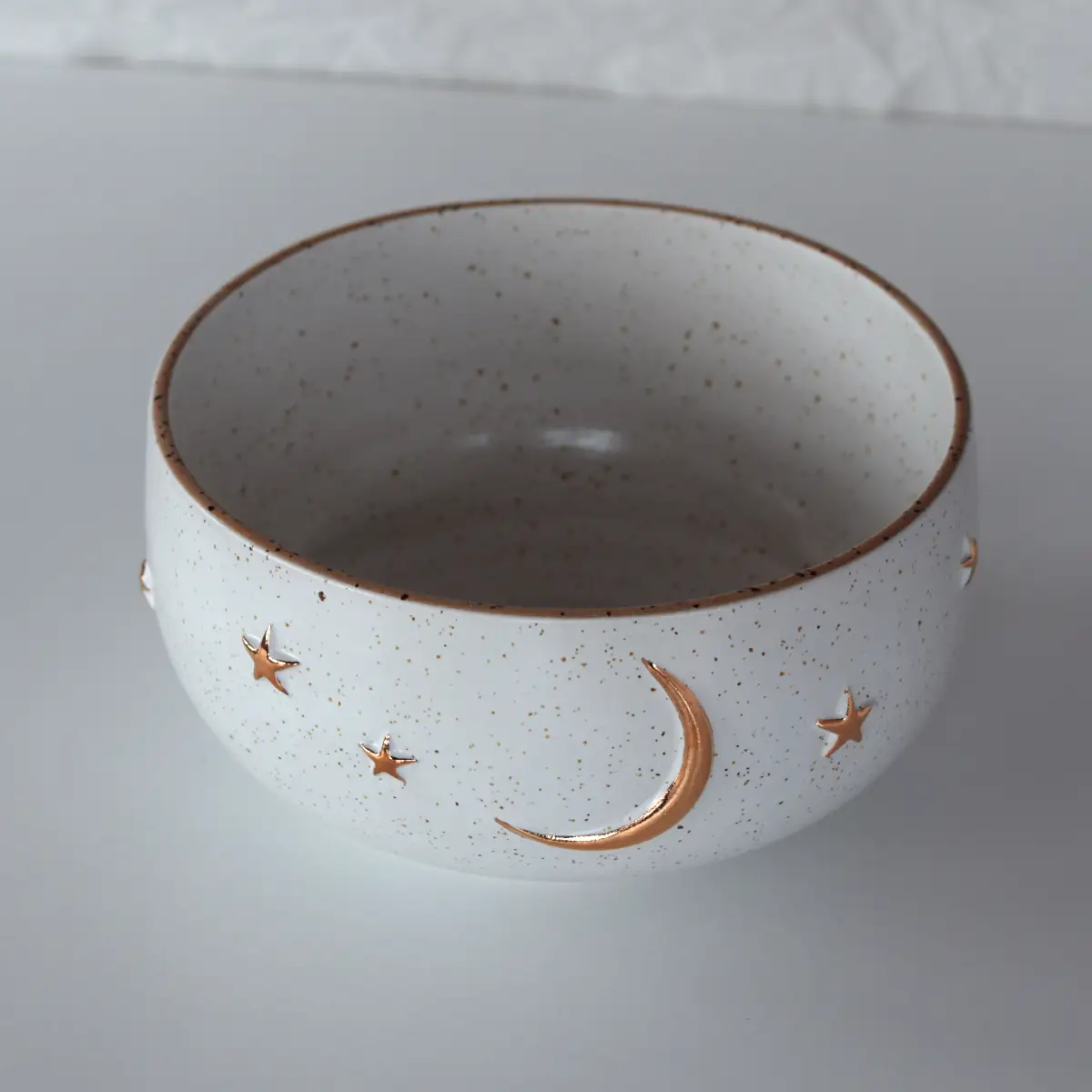 This celestial bowl is wheel-thrown from white speckled stoneware and finished with a raised gold crescent moon and stars in gold luster. At approx. Ø 7.7″ across, it works as a serving bowl, a salad bowl, or simply as a piece that anchors a table setting.