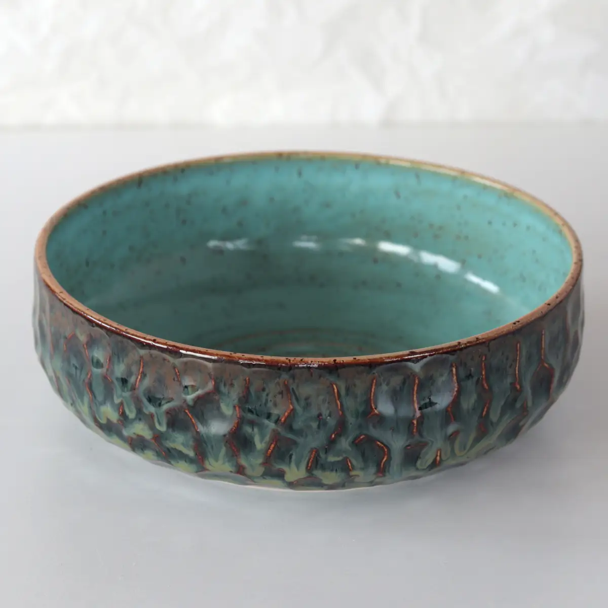 The carving is done after throwing, when the clay is leather-hard — a precise and time-consuming process that gives each bowl its distinct surface texture. Available in two forms: wide and shallow for serving, or deeper and rounded for soups and grains. Fired at high temperatures for durability.